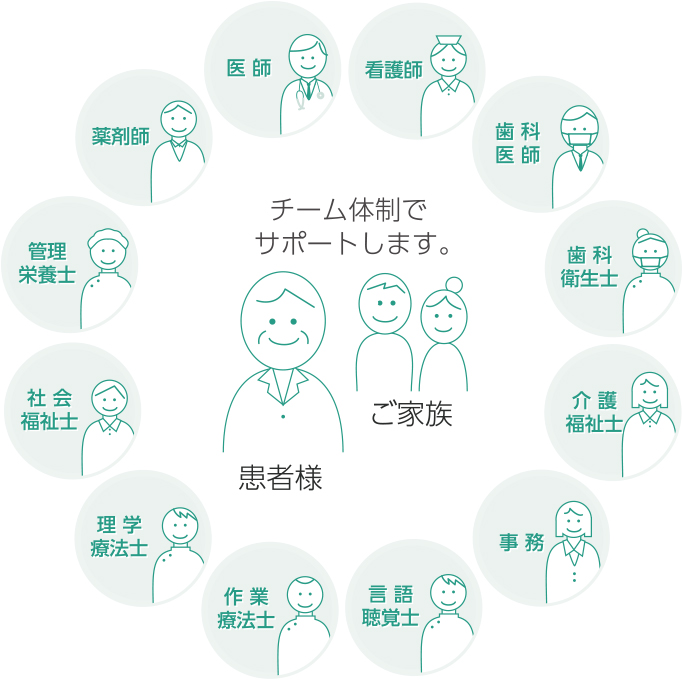 私たちは「たとえ障がいがあっても再びその人らしく生き生きとした生活ができるように」様々なニーズに柔軟にお応えできるよう、多職種チームでリハビリテーションサービスを提供します。