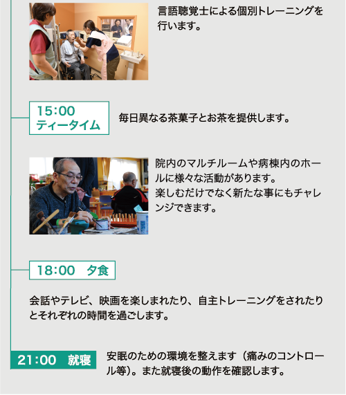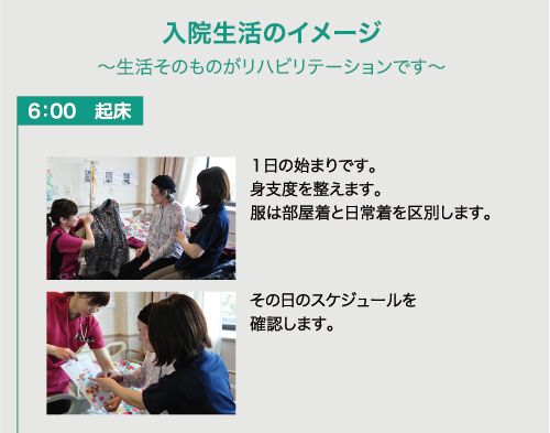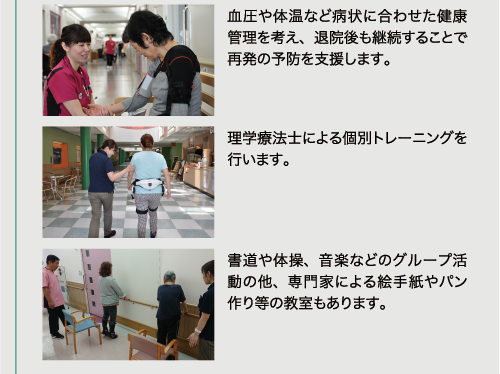 入院は回復期リハビリテーション病棟と障害者施設等一般病棟、医療療養病棟の病棟機能があり、それぞれ多職種によるチーム制をとり、入院生活そのものがリハビリテーションとなるよう取り組んでいます。また、退院後を見据えた入院生活となるよう、様々な行事や活動も提供しています。