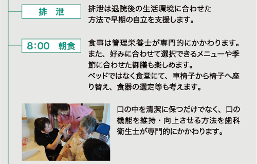 各チームに歯科衛生士を配置し、歯科医とともに口腔・嚥下へのリハビリテーションにも力を入れています。