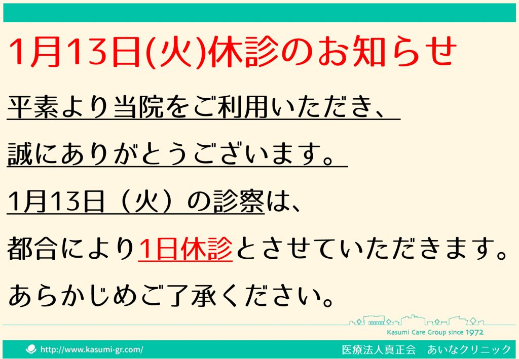 あいなクリニック 1月13日(火) 1日休診のお知らせ