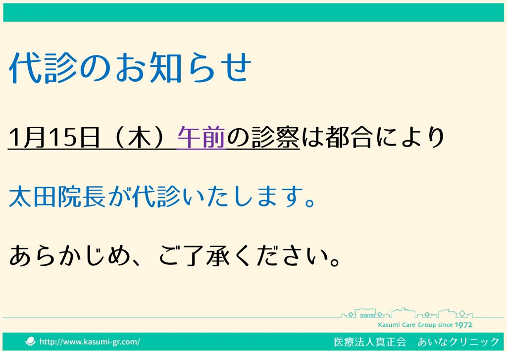 あいなクリニック 1月15日(木) 午前代診のお知らせ