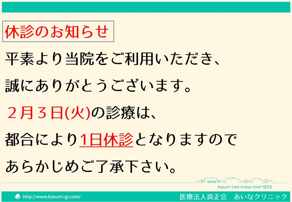 あいなクリニック 2月 3日(火) 1日休診のお知らせ