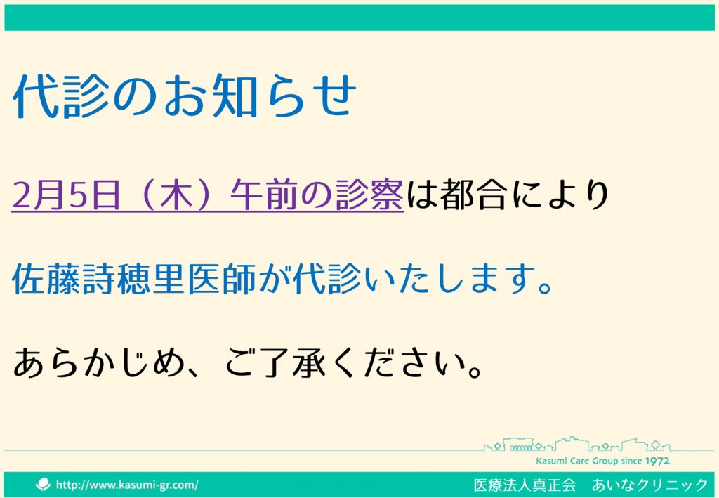 あいなクリニック 2月 5日(木)午前 代診のお知らせ