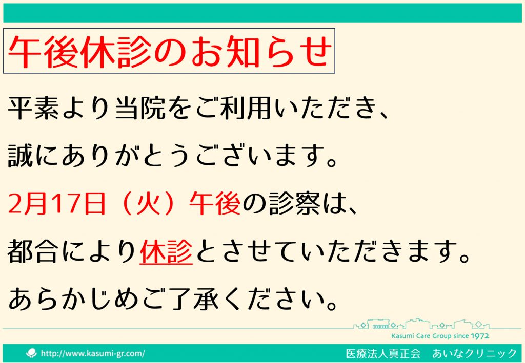あいなクリニック 2月17日(火)午後 休診のお知らせ