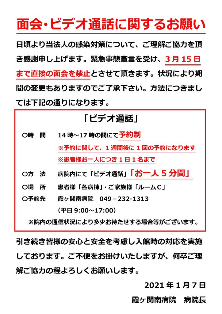12月3日より制限しております面会に関して、継続してビデオ通話による面会とさせていただきます。