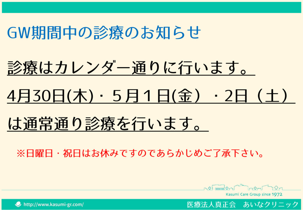 あいなクリニック ゴールデンウイーク期間中の診療のお知らせ