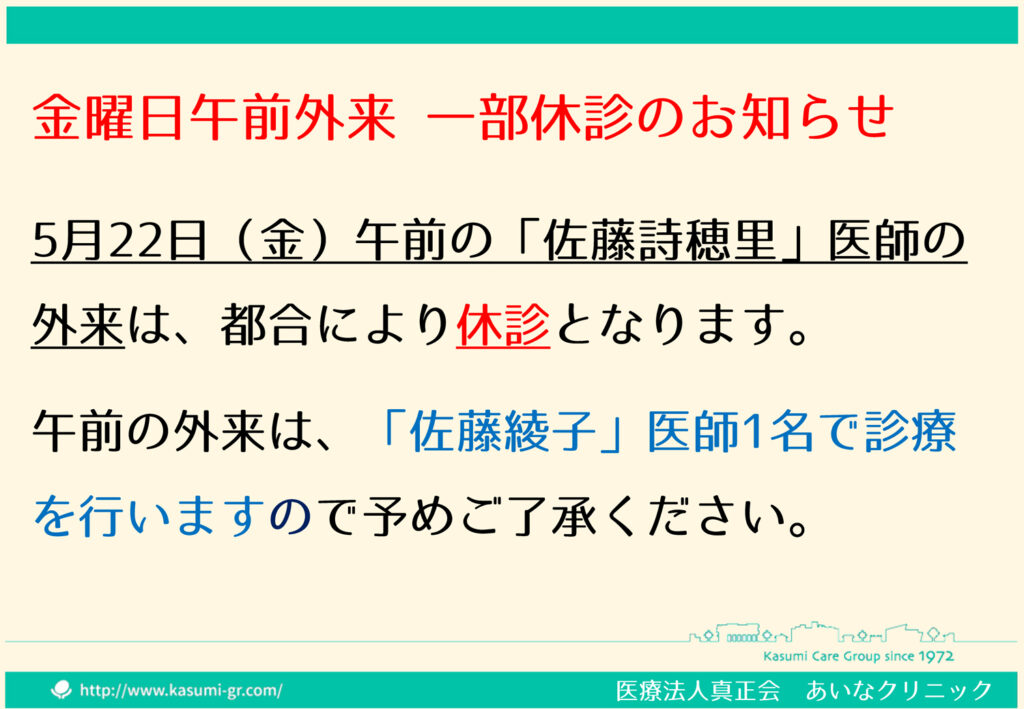あいなクリニック 5月22日(金)午前医師1診体制のお知らせ